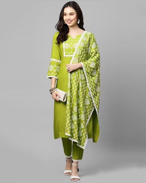 Package contains: 1 kurta, 1 pants, 1 dupatta Hand wash Bottomwear fabric: cotton Dupatta length: 2.2 m Dupatta fabric: cotton Kurta, Bottomwear & Dupatta 80% Cotton, 20% Polyester