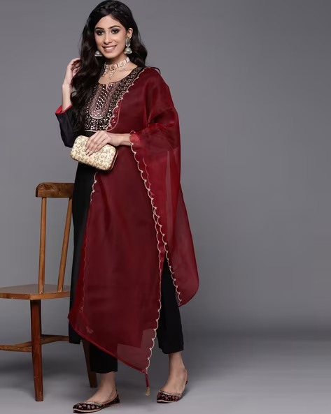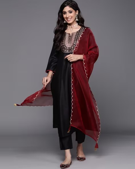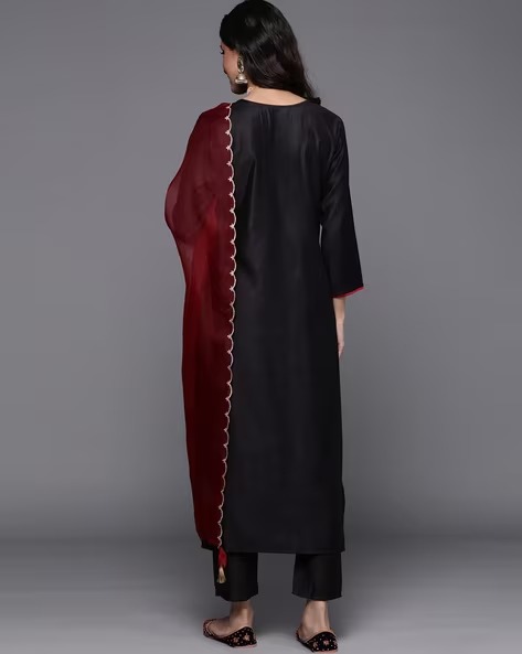 Bottomwear fabric: viscose, rayon blend Dupatta length: 2.25 m Dupatta fabric: organza Package contains: 1 kurta, 1 pants, 1 dupatta Kurta, Bottomwear & Dupatta Hand wash separately Rayon